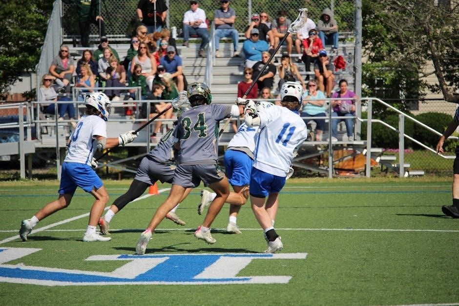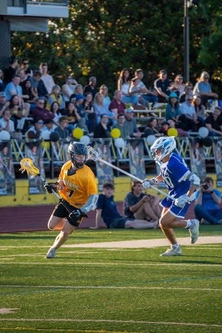 NFHS lacrosse rules PDF details fundamental aspects like field layout, game duration, and player conduct, ensuring standardized play across all high school competitions.